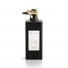 Le flacon en verre satiné est associé, dans les tons de noir mat, à un bouchon sculpté en métal doré qui reproduit fidèlement la tête miniature du levriero italien.