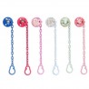 La pinza, que se sujeta a la ropa, lleva unida una argolla en la que introducir el chupete. Muy cómodo y práctico. Máxima sujeción. A partir de +0 meses.