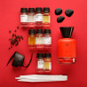 Le parfumeur, Alexandra Carlin, s’est inspiré des créations de Pierre Soulages pour tenter d’en exprimer l’essence. Elle a imaginé un parfum sans liant, sans bruit de fond et dont les facettes, successions d’impacts abstraits et contrastés, expriment le noir et sa luminosité infinie. Le résultat ? Une eau de cuir qui n’entre dans aucune catégorie. Bourgeons de cassis en pointillé, overdose de poivre, de styrax, de fucus et de cade : une palette de couleurs sombres pour traduire chaque intensité de noir. Le scintillement de l’encre noire, évocation du mercure obscur et du mat de la lave carbonisée.
