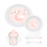 Composé d’assiette, bol, tasse anti-goutte à deux poignées, cuillère et fourchette.