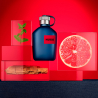 Laqué dans un bleu denim mat, le flacon HUGO JEANS arbore un logo rouge et noir audacieux, identique à l'emblématique jean HUGO.