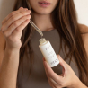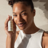 - Stimule la synthèse du collagène et de l'élastine, grâce à la vitamine C et aux peptides : il améliore les rides et la flaccidité.