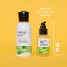 Son eau végétale d'aloe vera bio et de pomme verte agit comme un biostimulant pour la régénération cellulaire et détoxifie la peau.