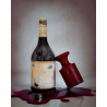 Des taches de vin pourpre s'étalent sur les pages d'un vieux journal en cuir, imprégnant le papier de marques vives et irrégulières.