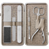Questo bellissimo set di manicure e pedicure con rivestimento in cuoio include un'esclusiva selezione di nostri strumenti di prima qualità affinché le tue mani e le tue torte siano perfettamente rifinite e arretrate. Realizzati in acciaio inossidabile, eleganti utensili, están progettati per una precisione impeccabile, per una corte uniforme y sin esfuerzo, in un tamaño perfecto para llevar de viaje.