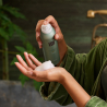 Applicare una piccola quantità sulla mano e osservare il gel trasformarsi in una schiuma ricca e nutriente a contatto con l'acqua.