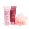 Il set offre la delicata e fresca fragranza dei fiori di ciliegio, combinando praticità e stile in un brillante beauty case con cerniera e paillettes.