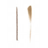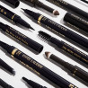 Numa extremidade, um lápis único com ponta triangular preenche as sobrancelhas com um traço fino ou grosso personalizado.