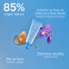 Oferece uma proteção antioxidante e contra os agressores ambientais, com uma fusão de rosa selvagem & ampola; extrato de própolis patenteado.