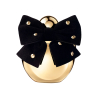 Coberto com um acabamento dourado espelhado, o icónico frasco em forma de maçã de Nina é adornado com um laço de veludo preto e bolinhas douradas inspiradas nas últimas criações de moda de Harris.
