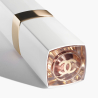 O icónico estojo branco e dourado é adornado com uma tampa transparente que evoca o novo acabamento cintilante da maquilhagem.