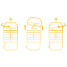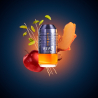 Os tons complementares de azul aço e laranja vibrante criam um frasco monolítico com uma forma imponente e intrigante.